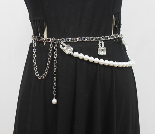 Vintage Pearl Rhinestone Multilayer Metal Chain Tassel Waist Chain Clothes Decoration Thin Metal Belt